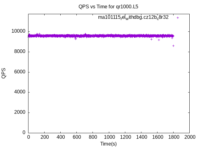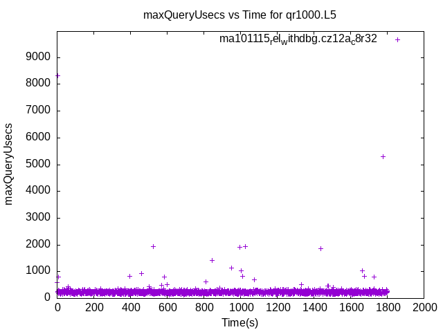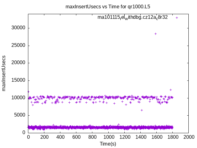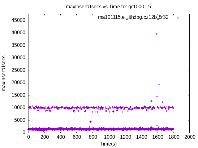 These have results per 1-second interval for: insert rate (IPS), max insert reponse time, delete rate (DPS), max delete response time, query rate (QPS) and max query response time. The results are from 1 client while the test may have N clients where N > 1. Deletes might not have been enabled for this benchmark step, in which case those graphs will show zero values. The test is run with a rate limit for the number of inserts/s. In some cases the DBMS is unable to sustain that rate. When a DBMS can sustain that rate IPS will be a horizontal line.