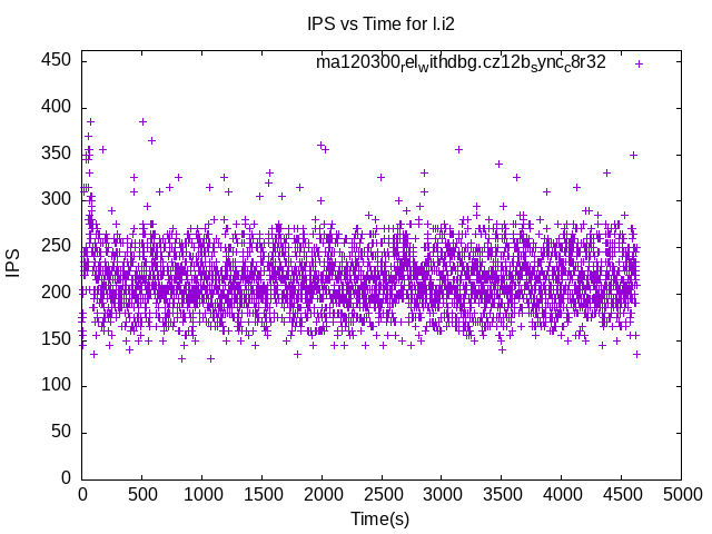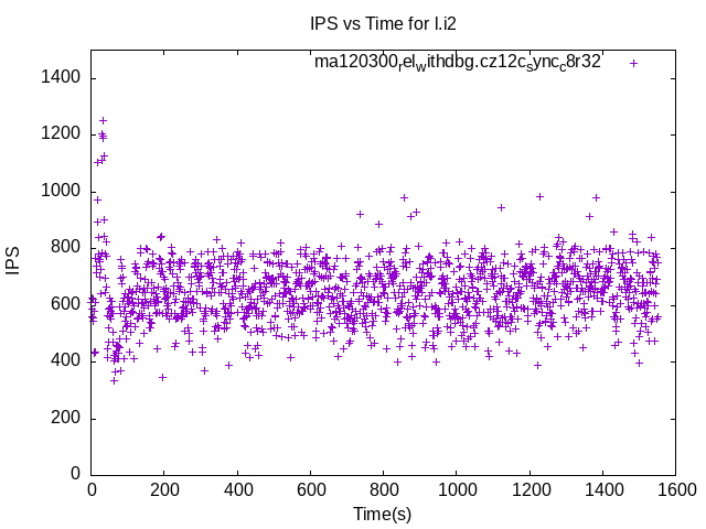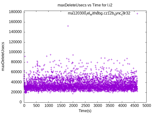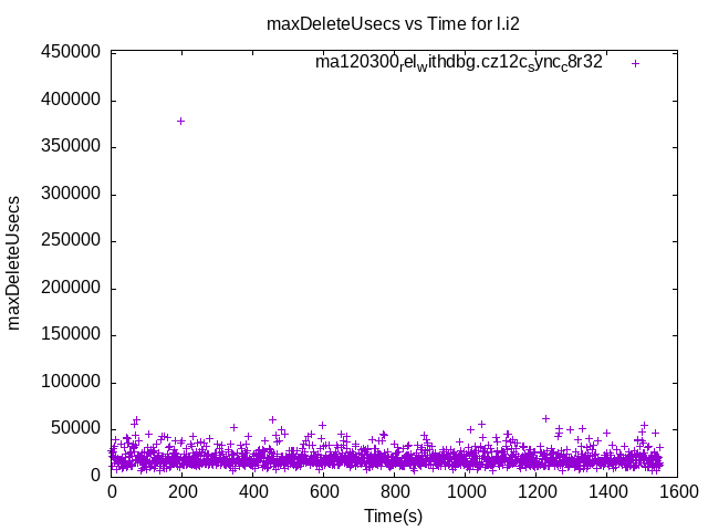 These have results per 1-second interval for: insert rate (IPS), max insert response time, delete rate (DPS) and max delete response time. The results are from 1 client while the test may have N clients where N > 1. Deletes might not have been enabled for this benchmark step, in which case those graphs will show zero values.
